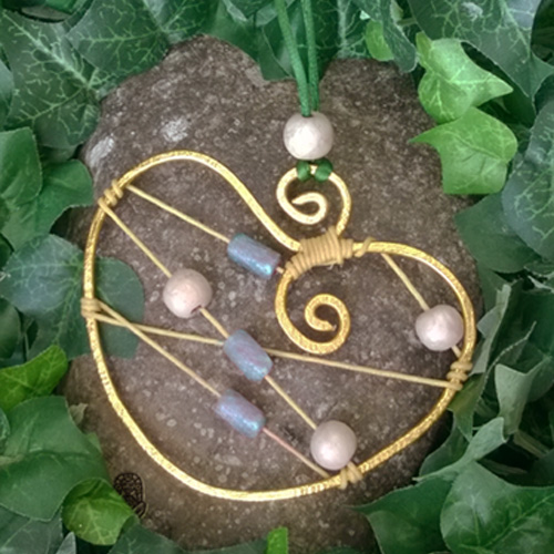 Handcrafted out of gold colored craftwire this pendant has turquoise and cream colored beads on pale yellow cording. The pendant hangs on a 24″ green satin cord with open ends so that the wearer may adjust the length.
