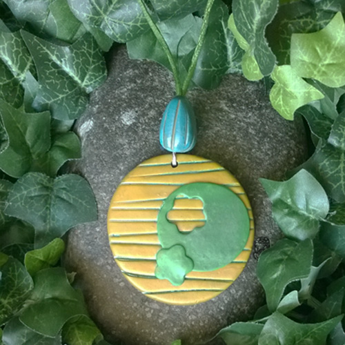 Handcrafted golden yellow and green polymer clay pendant hanging on a 24″ satin cord. Pendant is approximately 2 1/2″ round.
